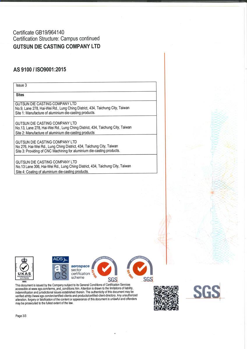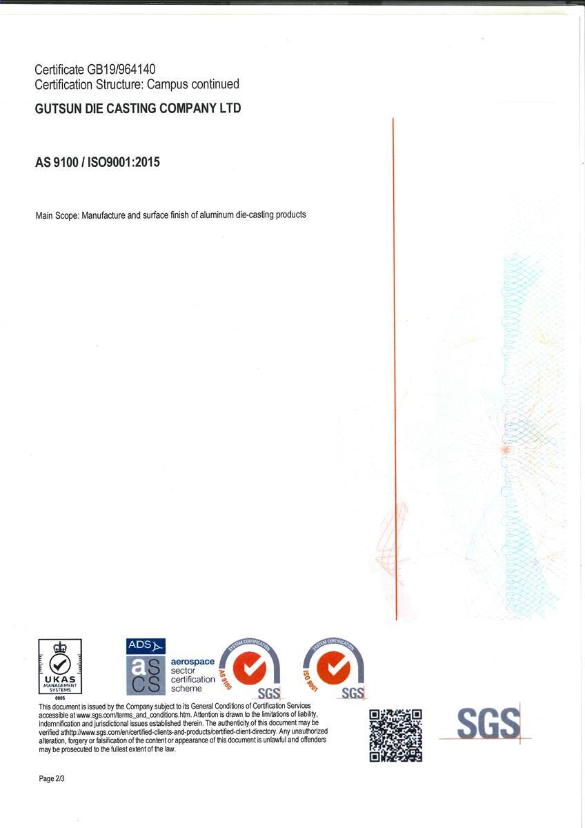 さまざまな業界のさまざまな要件に従って、当社はISO 9001:2015、国際自動車品質管理システムIATF 16949:2016、航空宇宙品質管理システムAS 9100Dの認証を取得し、高品質で安定したアルミニウム合金をお客様に提供しています。ダイカスト製品の顧客満足度向上を目指します。