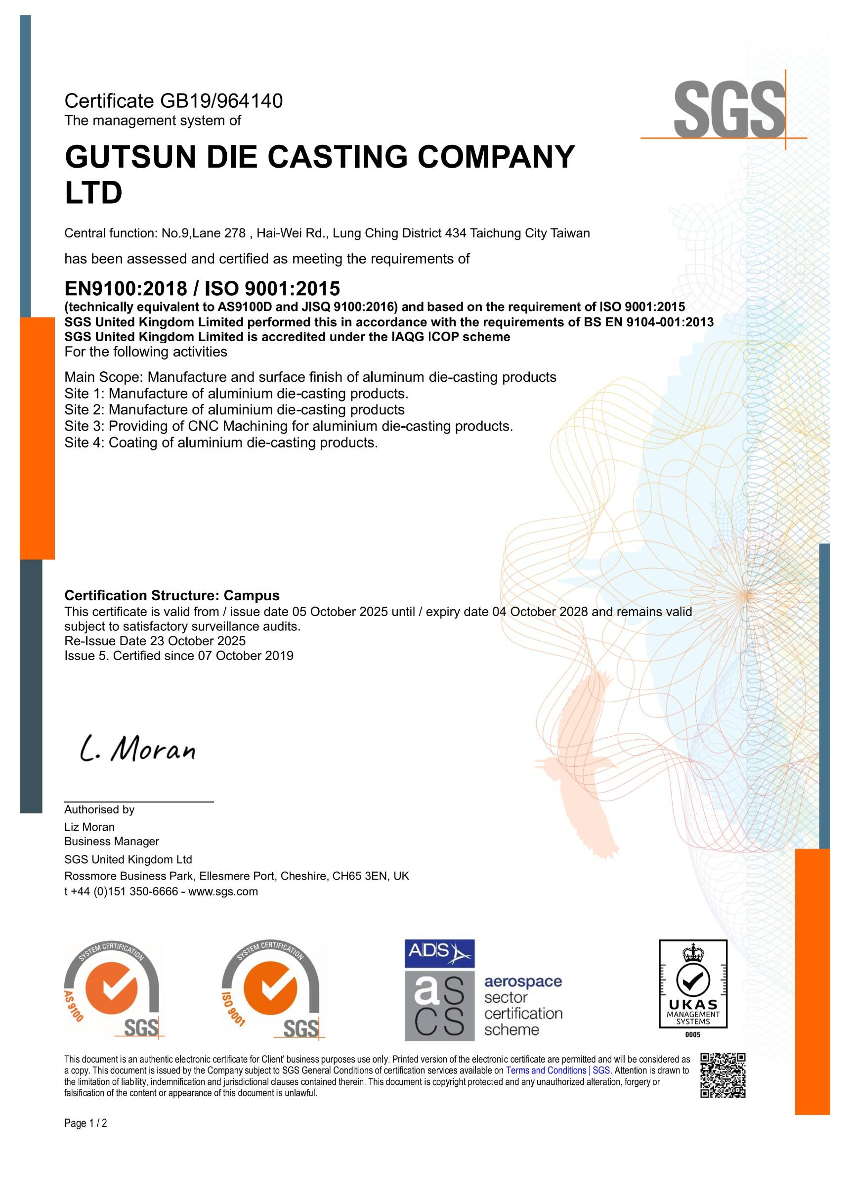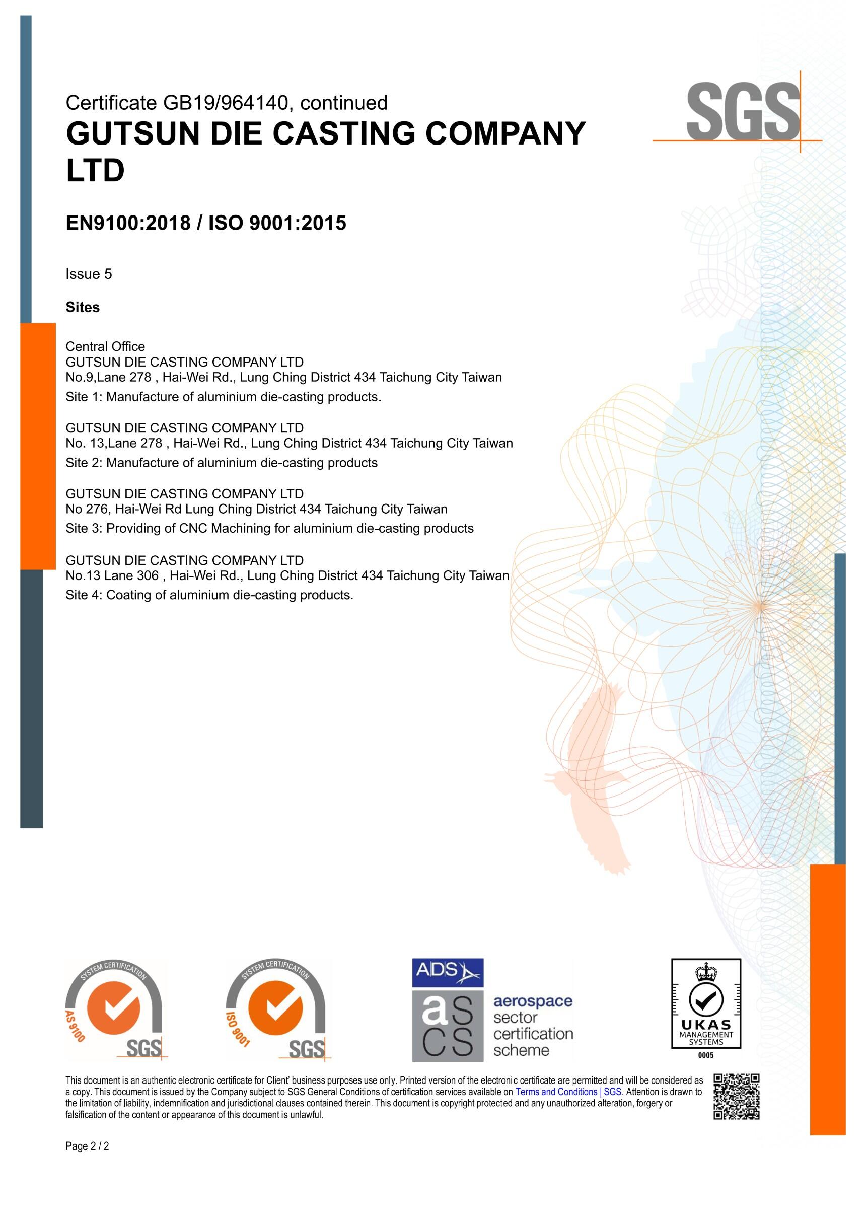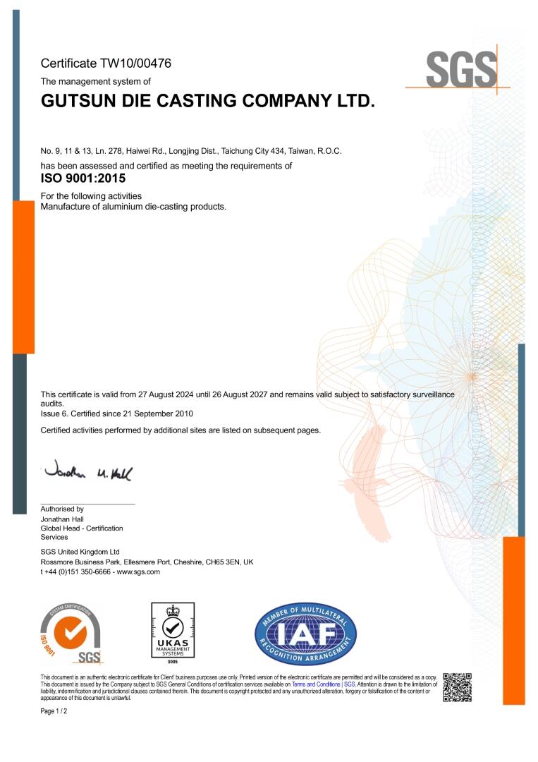 さまざまな業界のさまざまな要件に従って、当社はISO 9001:2015、国際自動車品質管理システムIATF 16949:2016、航空宇宙品質管理システムEN 9100Dの認証を取得し、高品質で安定したアルミニウム合金をお客様に提供しています。ダイカスト製品の顧客満足度向上を目指します。